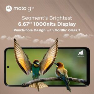 Details: 000 nits Display Experience outstanding clarity while watching videos, scrolling through social media, or playing games with the moto g05 segment's brightest 6.67” display, offering a peak brightness of 1000 nits for vibrant visuals in any lighting. The sleek punch-hole design adds elegance, while the 90Hz refresh rate ensures smooth transitions and seamless scrolling. Protected by durable Gorilla Glass 3 and enhanced with Water Touch Technology, this display is built to impress and endure.