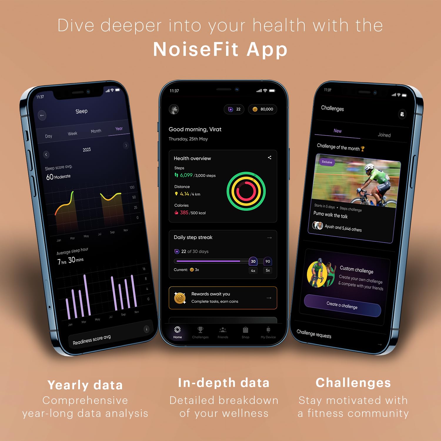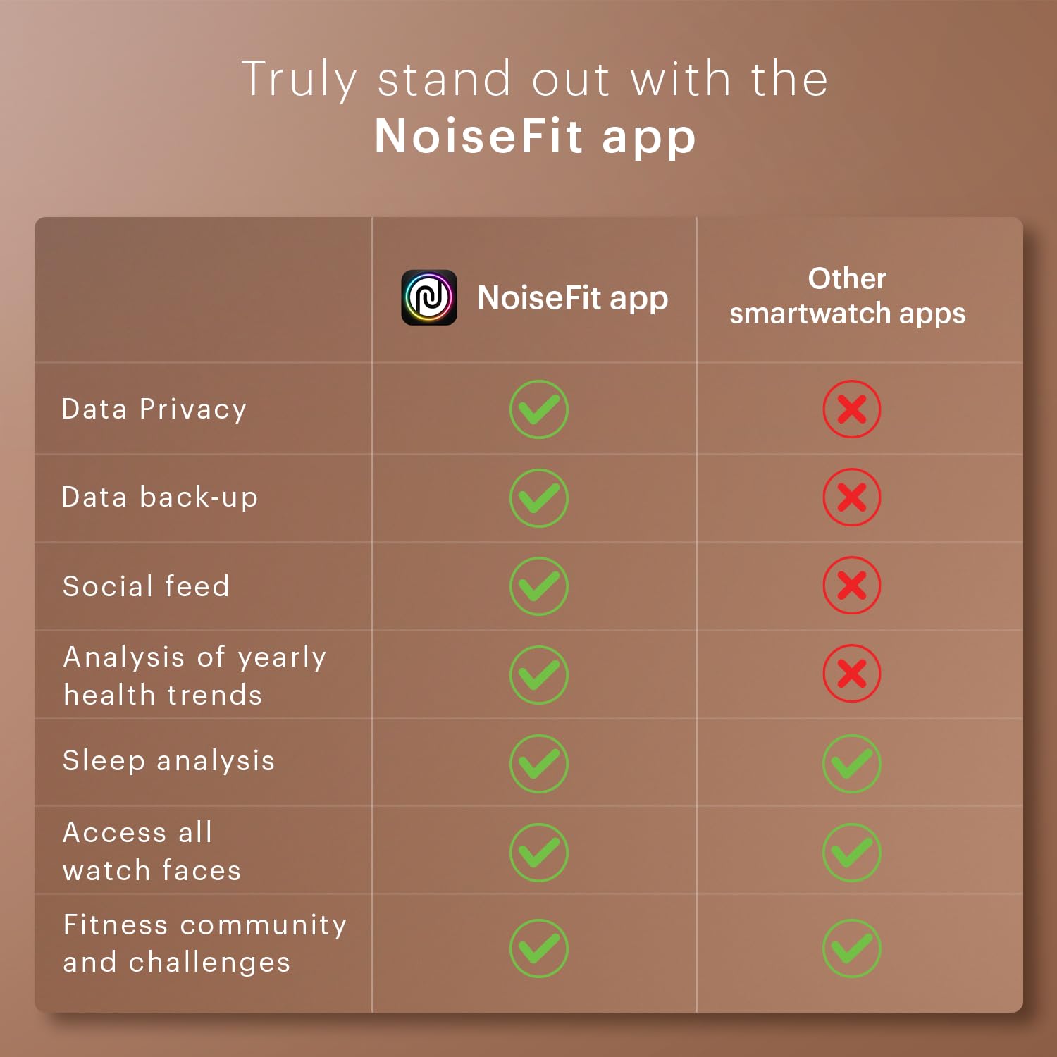 - BT Calling: Stay connected on the go making every call effortlessly convenient.;NoiseFit app: Connect with the NoiseFit app where your health data and privacy are always protected. Unlock your peak potential by participating in challenges, track your progress, and keep pushing your limits with a community of fitness enthusiasts.