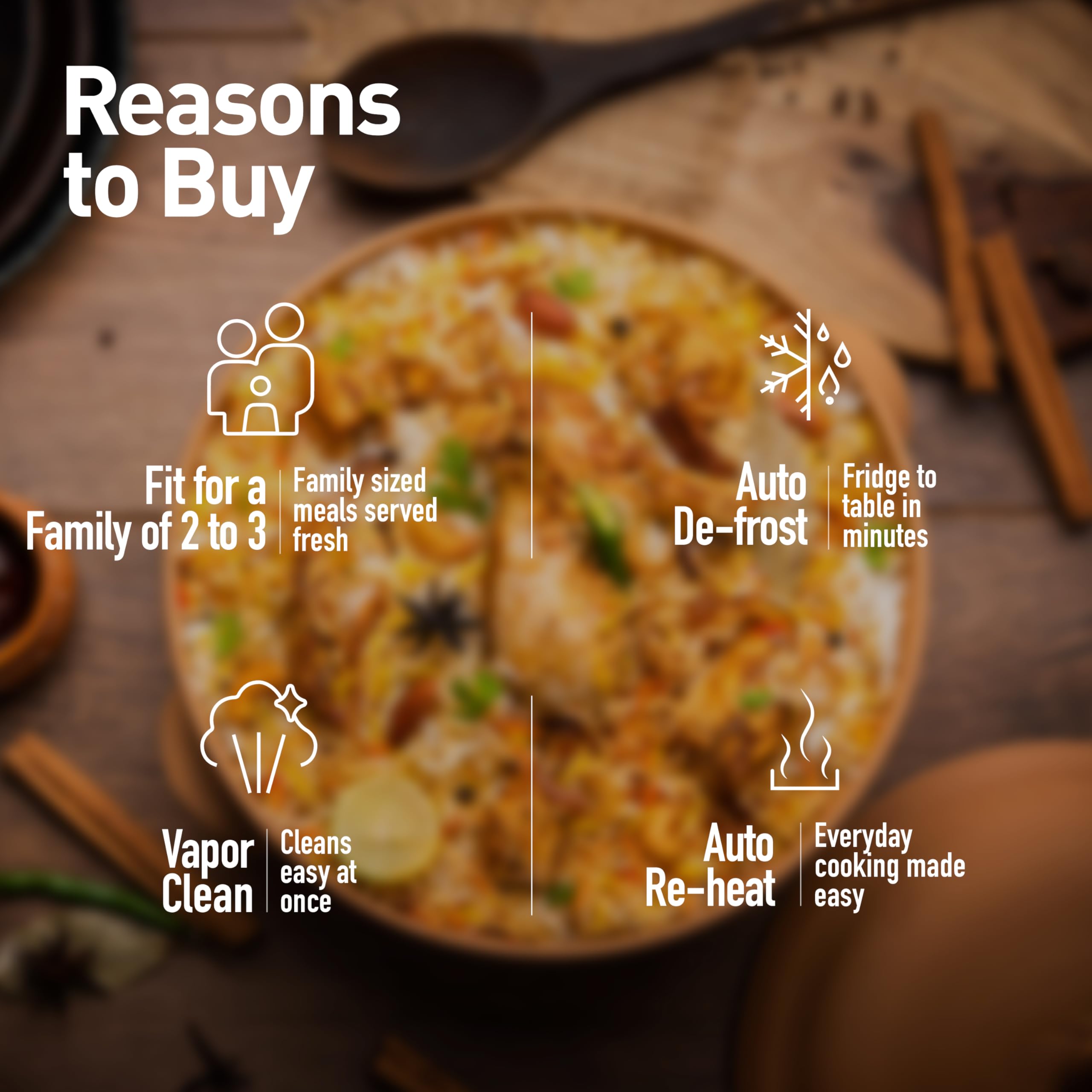 - Re-Heat & Defrost: Auto programmed reheat and defrost modes ensure even heating or defrosting of food without compromising on the textures of flavour.