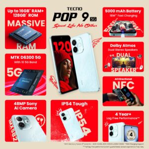 Tecno POP 9 5G (Azure Sky, 8GB+128GB) | D6300 5G Processor | 48MP Sony AI Camera | 4+ Year Lag Free Fluency |5000 mAh Battery |Dual Speaker | Without Charger